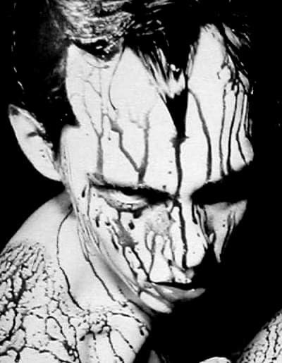 blood sleeve with band photo and lyrics, and pool of blood colored